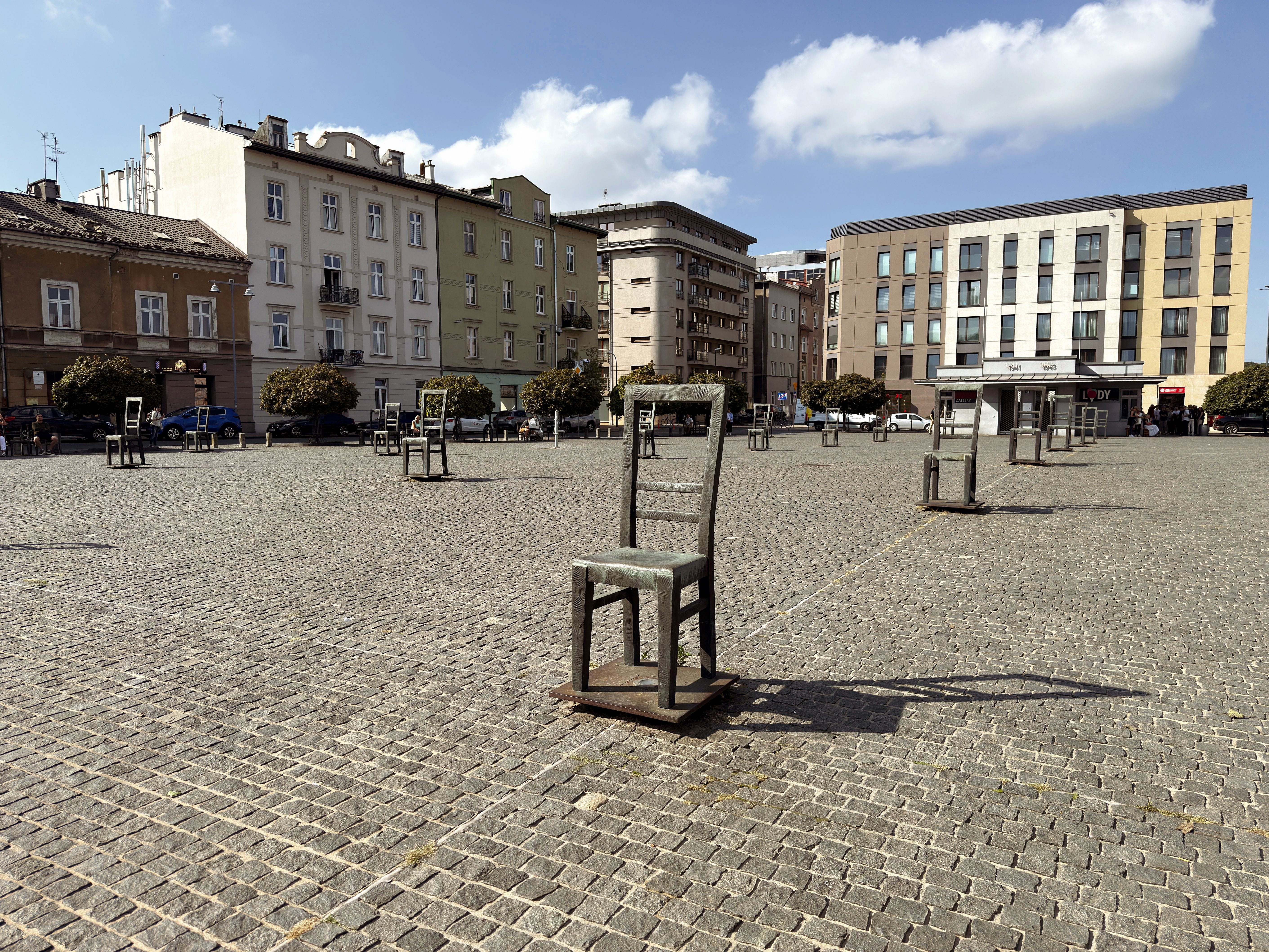 The route then leads to Ghetto Heroes Square, the former center of the Kraków Ghetto and a key site connected with deportations. Today, the square functions as a place of remembrance, marked by the powerful memorial of empty metal chairs symbolizing the lives lost.