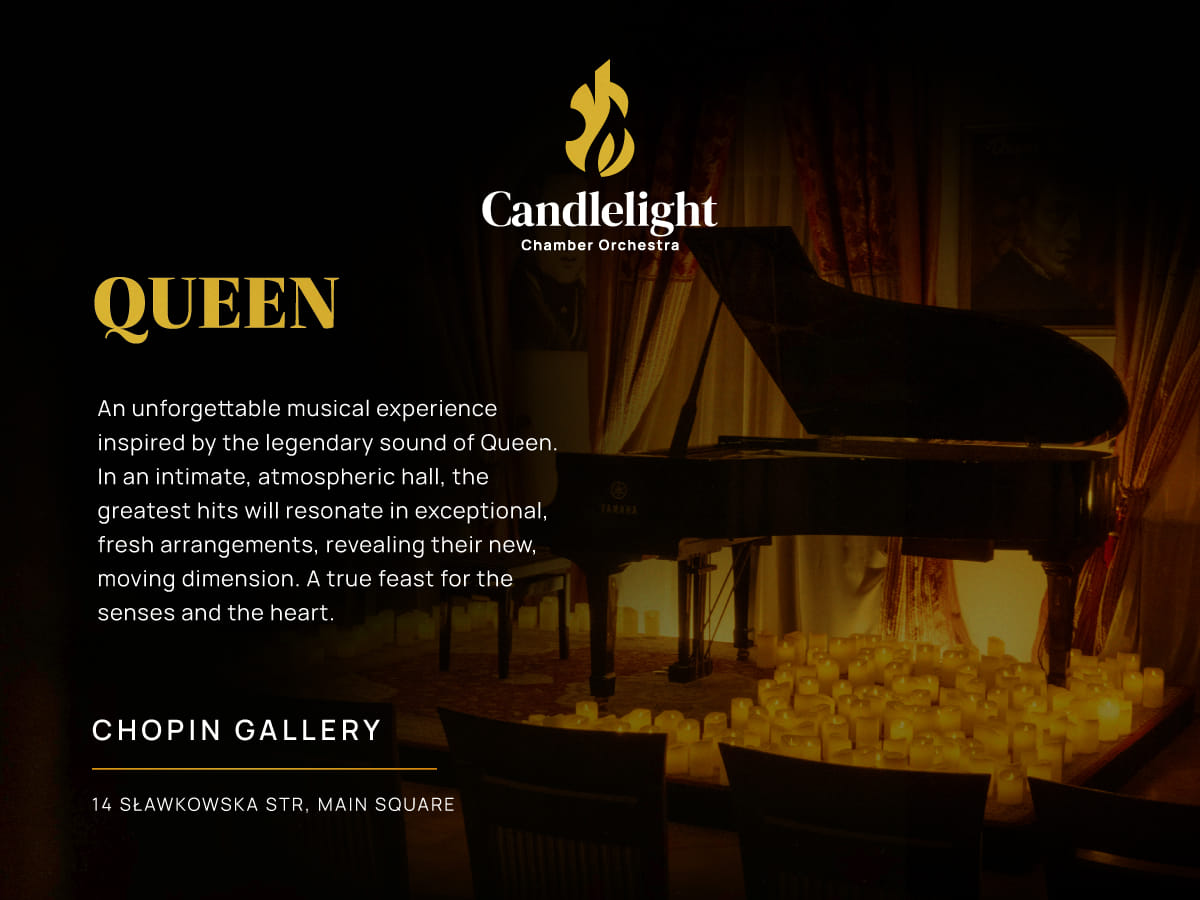 Just meet up at the Chopin Gallery, grab your seat in the candlelit hall, and let the music take over. The performers will kick things off with a quick intro, then dive into about 50 minutes of Queen’s best songs, all with that cool classical twist. Take in the incredible setting, the music, and the vibe - it’s a one-of-a-kind experience right in the middle of Kraków.